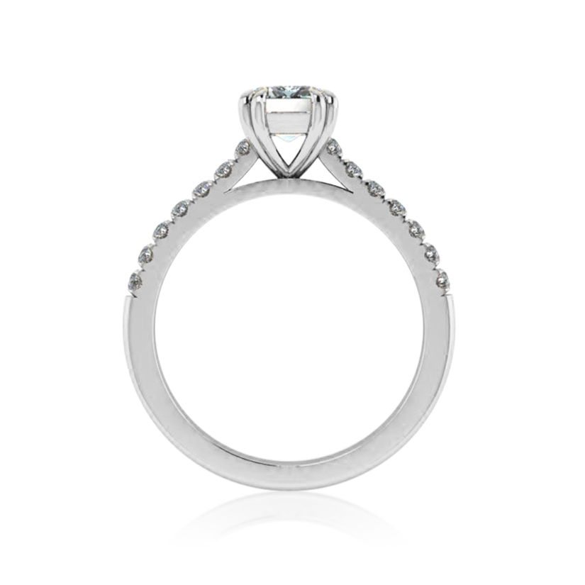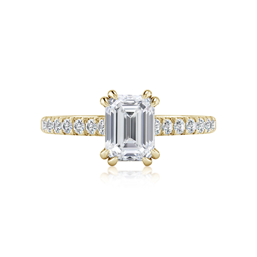 Double four claw setting holding emerald cut centre stone, cut down set diamond band