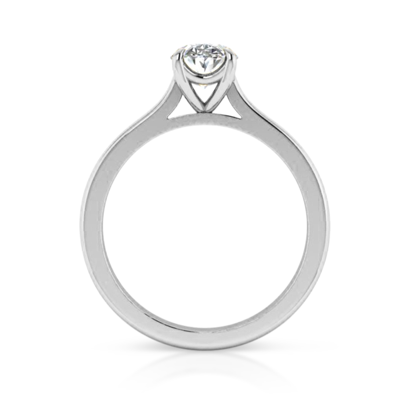 This classic ring design features a four-claw setting with a unique swing setting that enhances the brilliance of the oval diamond. The scalloped centre stone setting adds a touch of sophistication and artistry, while the tapered band provides a sleek and modern look. Meticulously crafted with attention to detail, this ring is a perfect combination of traditional charm and contemporary style. Choose this stunning piece to symbolise your eternal commitment and create unforgettable memories.