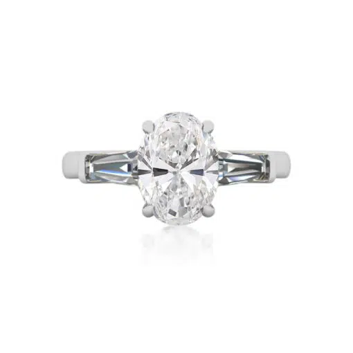 Classic oval solitaire diamond ring, two tapered baguette flank the centre stone set in scolloped setting.